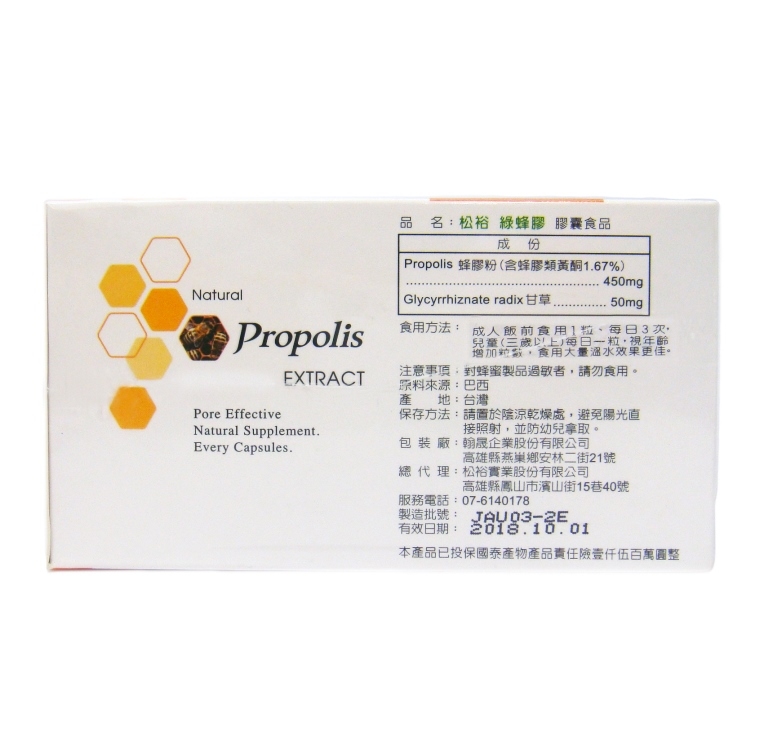 成份:(每粒)450蜂膠mg、甘草50mg、微晶纖維素、硬脂酸鎂。