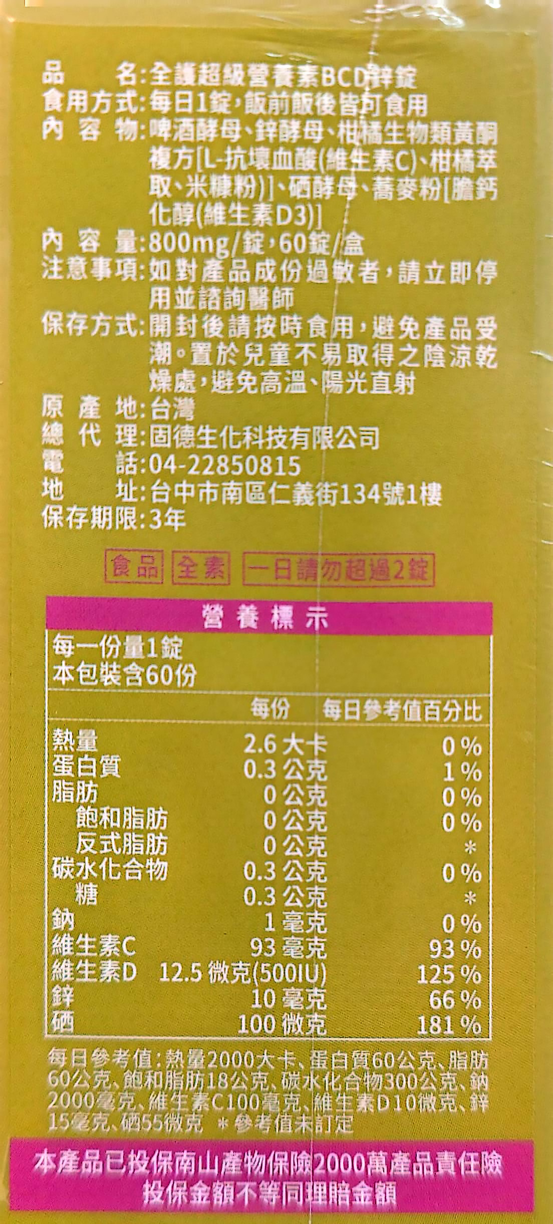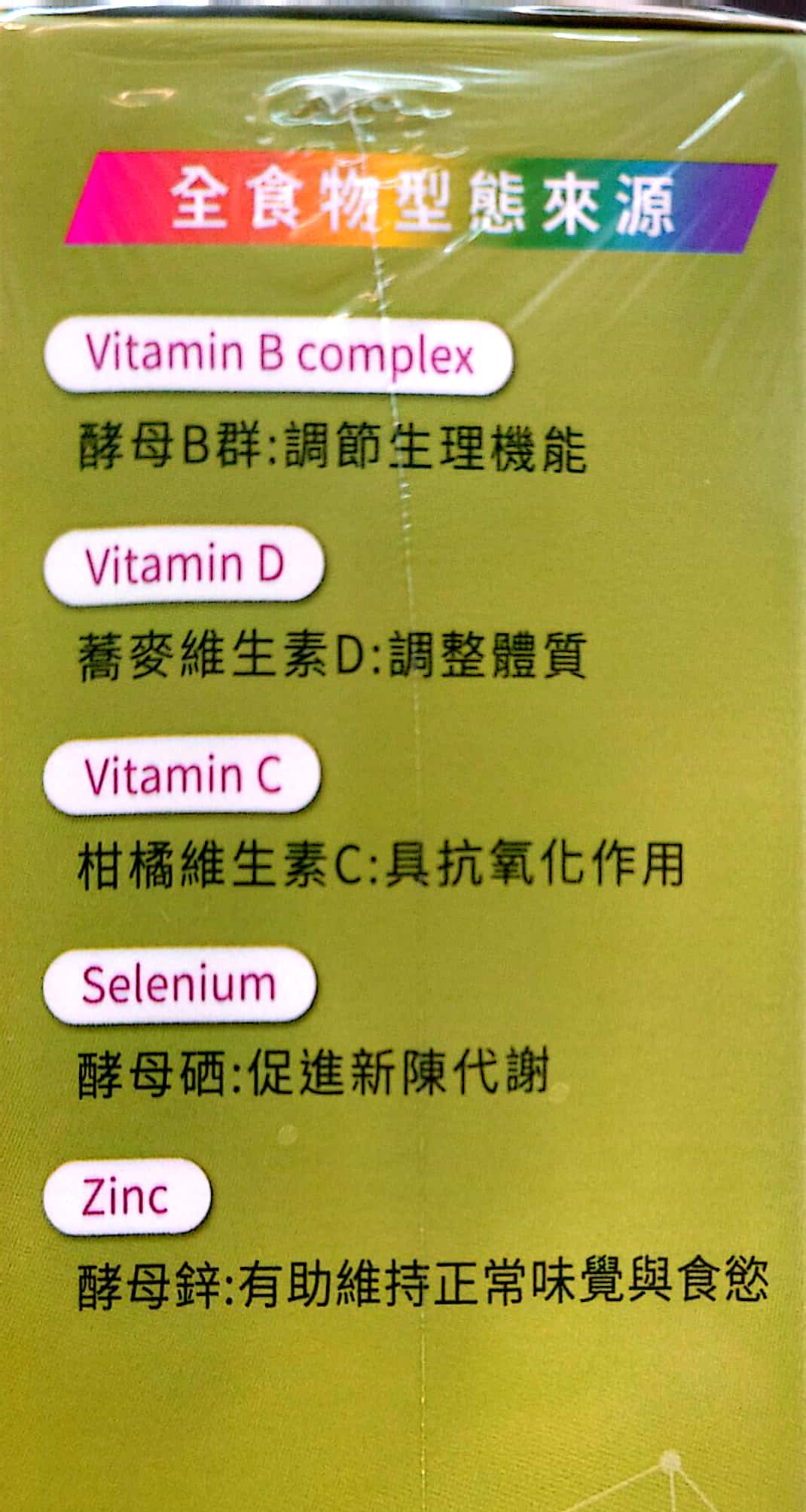 內容物:啤酒酵母、鋅酵母、柑橘生物類黃酮複方[L-抗壞血酸(維生素C)、柑橘萃