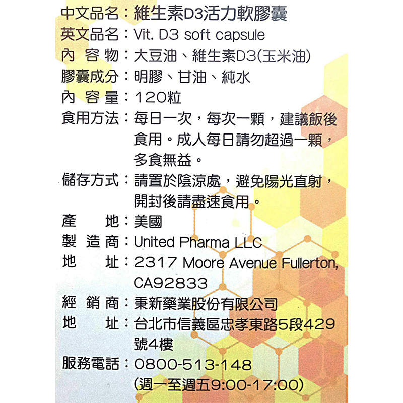 800IU,1天1粒,餐後食用商品名稱: 維生素D3活力軟膠囊商品規格: 120粒/罐貨源: 公司貨產地: 美國製造商:United Pharma LLC經銷商:秉新藥業股份有限公司地址:台北市信義區忠孝東路5段429號4樓服務電話:0800-513-148(週一~週五9:00~15:00)有效期間或保存期限: 每一批不同,歡迎詢問商品成分/材質:請參考圖片#D3 #維生素 #維他命 #秉新 #美國進口D3