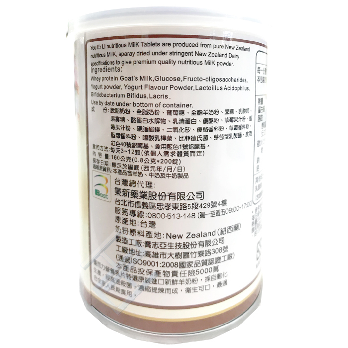 食用方式:每天3~12顆【綜合口味】內容量: 0.8gX200顆 含4種口味(原味、藍苺、草苺、優絡)【原味口味】內容量:0.8gX200顆商品名稱: 優而力原味羊乳片商品規格: 200錠/罐貨源: 公司貨產地: 台灣原料產地:紐西蘭(New Zealand)有效期間或保存期限: 每一批不同,歡迎詢問商品成分/材質:請參考圖片過敏原資訊:本產品含羊奶、牛奶及牛奶製品台灣總代理:秉新藥業股份有限公司#優而力 #羊乳片 #益生菌 #紐西蘭 #酪蛋白 #比菲德氏 #兒童羊奶片