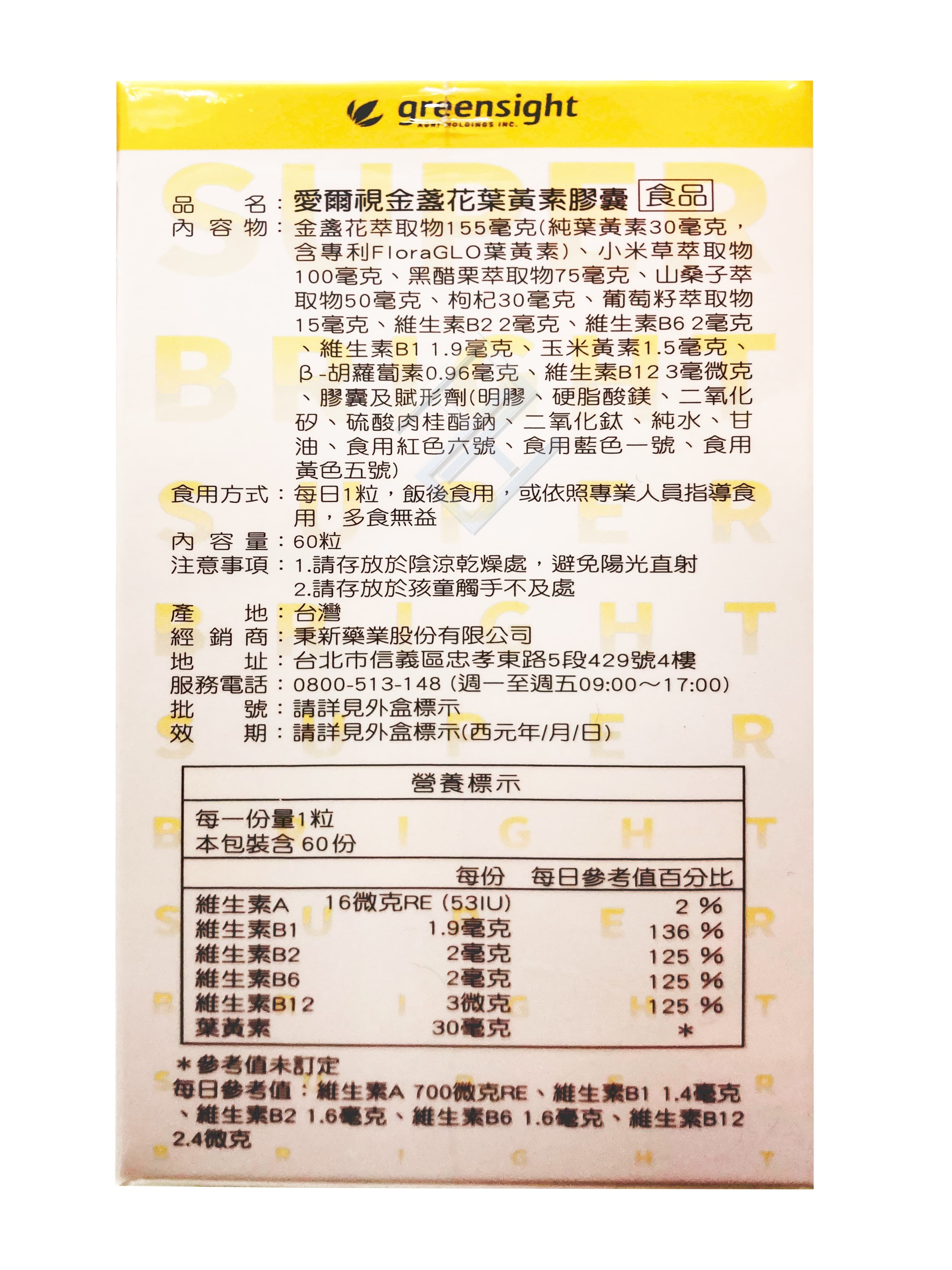 商品名稱: 愛爾視金盞花葉黃素膠囊商品規格: 60粒/盒貨源: 公司貨產地: 台灣供應商:秉新藥業股份有限公司地址:台北市信義區忠孝東路5段429號4樓服務電話:0800-513-148 有效期間或保存期限: 每一批不同,歡迎詢問商品成分/材質:請參考圖片