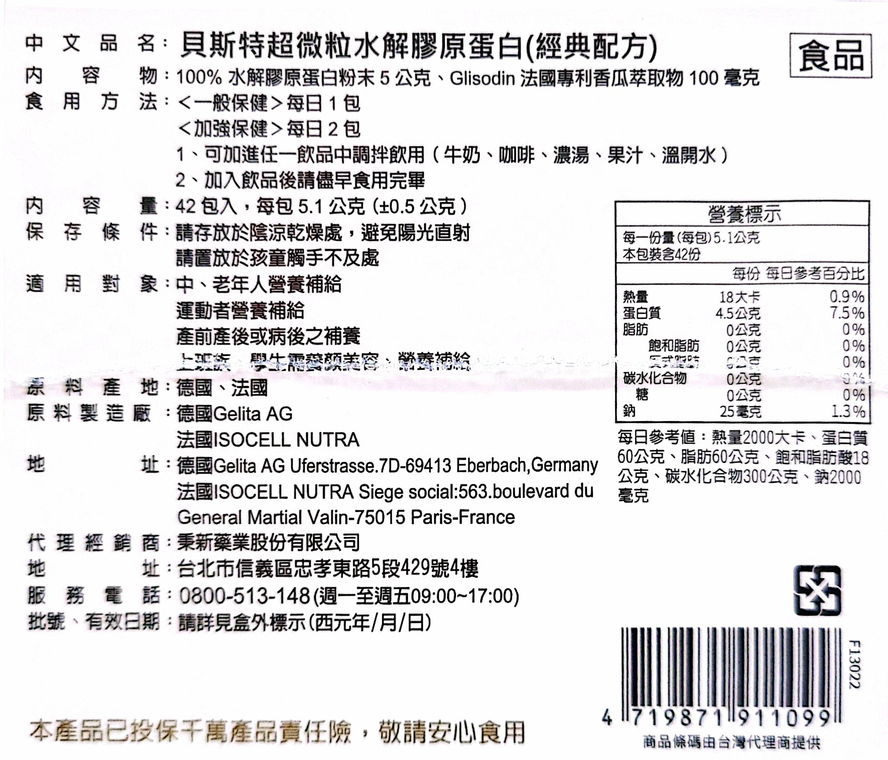 中文品名:貝斯特超微粒水解膠原蛋白(經典配方)