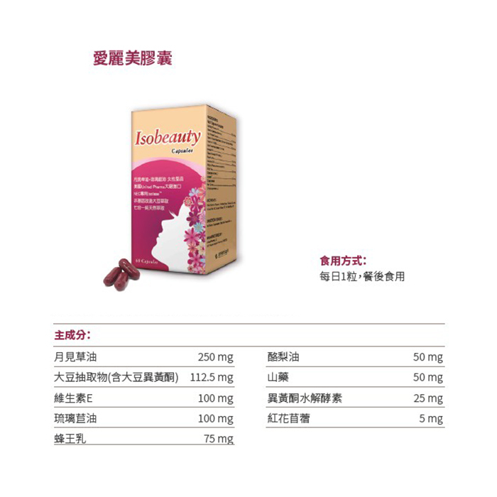 內容物:月見草油、大豆萃取物(含大豆異黃酮)、維生素E 100IU、琉璃苣油、蜂王乳、酪梨油、