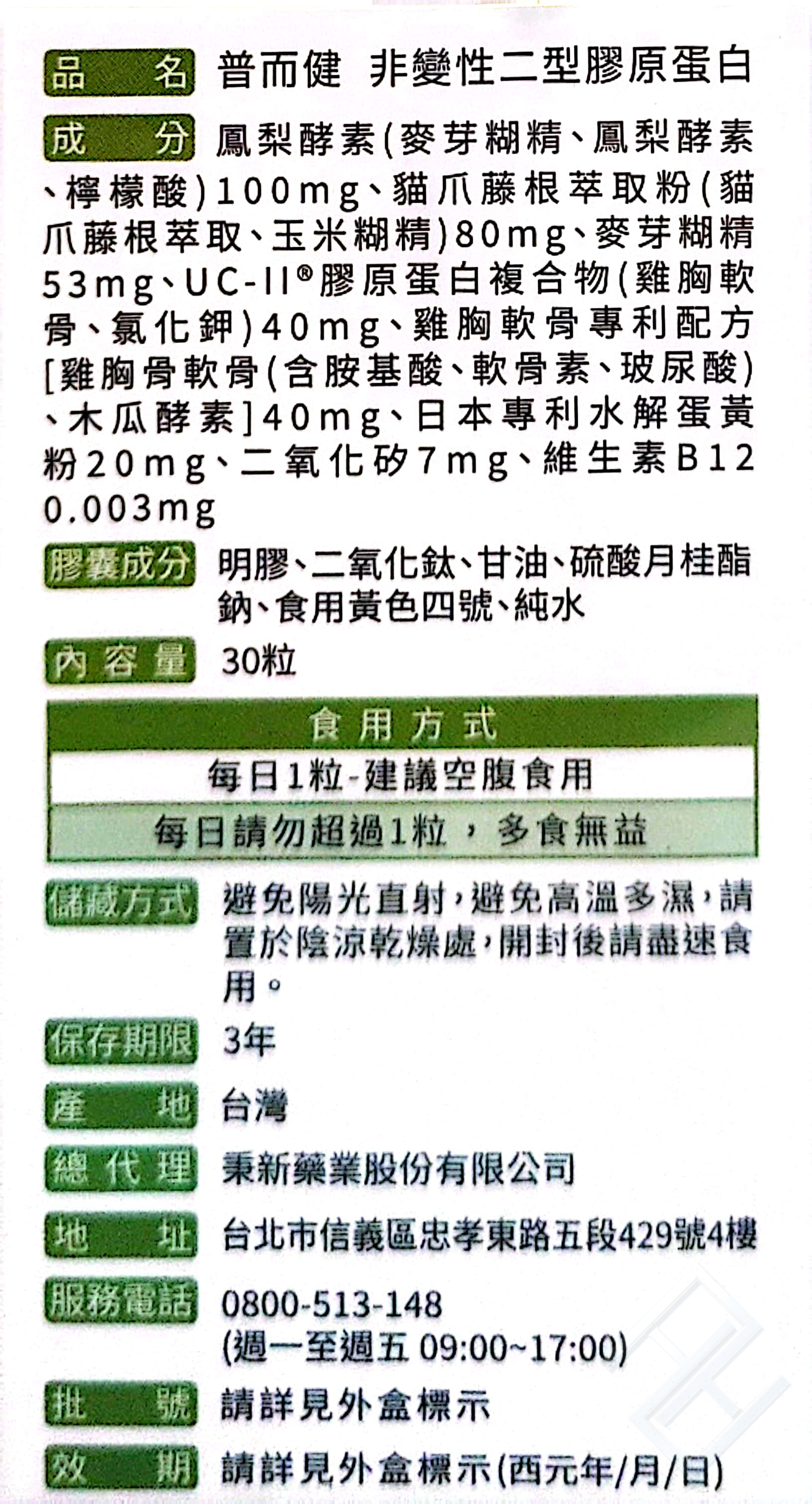 品名:普而健 非變性二型膠原蛋白