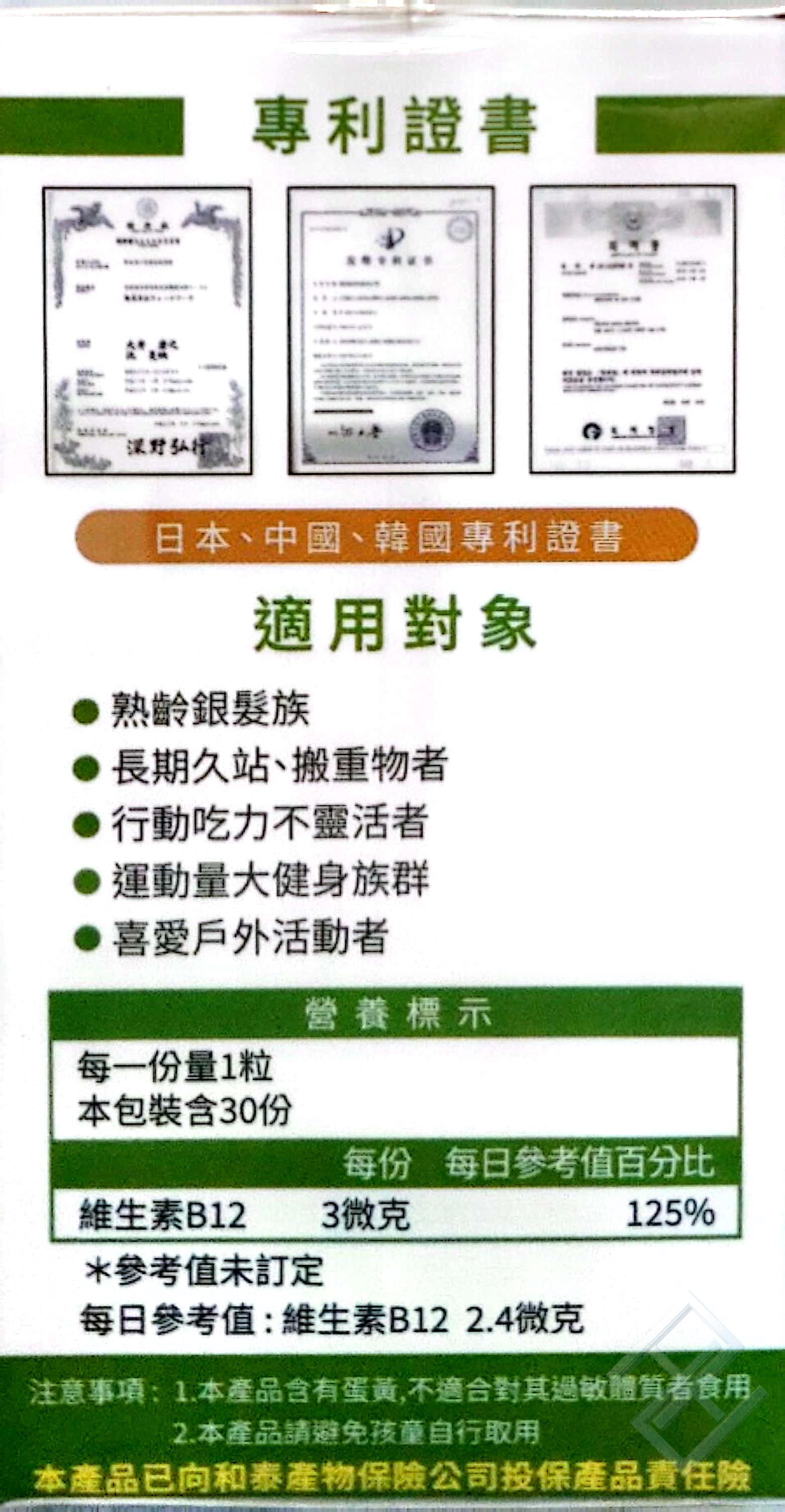 、木瓜酵素]40mg、日本專利水解蛋黃粉20mg、二氧化矽7mg、維生素B120.003mg