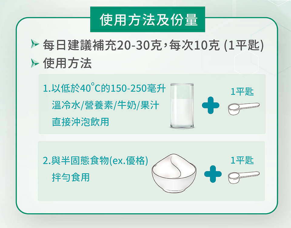 請用內附量匙取出粉末,倒入150-250ml低於40度的冷水、飲料,攪拌均勻後食用