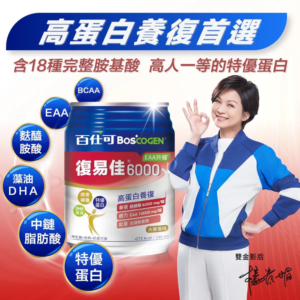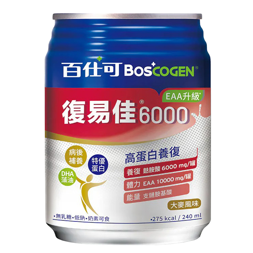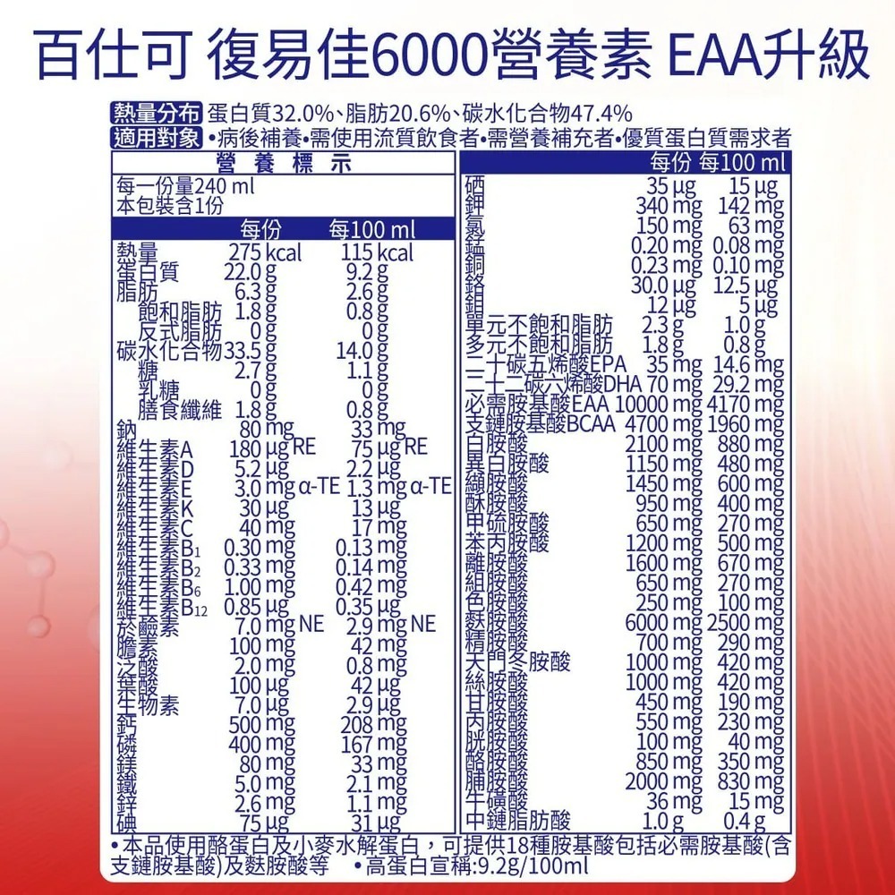 復易佳6000 EAA升級營養素的「特優蛋白 含18種完整胺基酸」是由麩醯胺酸、精胺酸、支鏈胺基酸等18種胺基酸組成,能提供養復、體力、能量,全方位的保健。