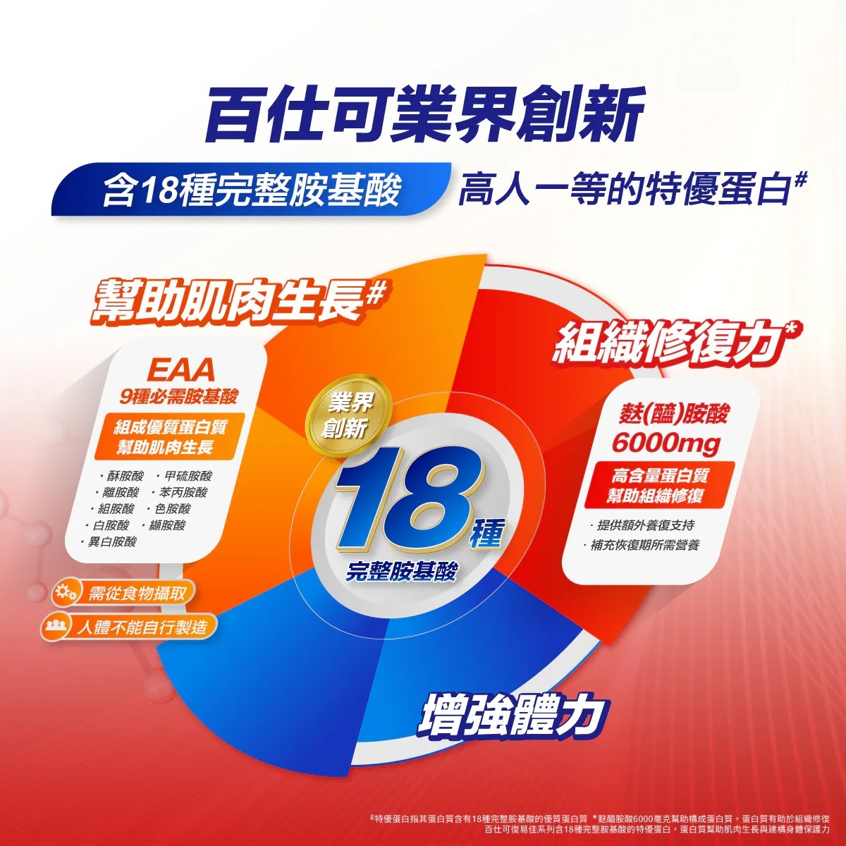 ■ 特優蛋白 含18種完整胺基酸:蛋白質能提供人體所需胺基酸,可用於肌肉生長,也有助於組織修復