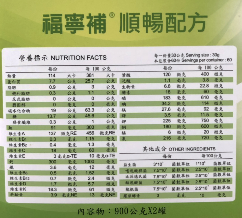 營養成分標示: