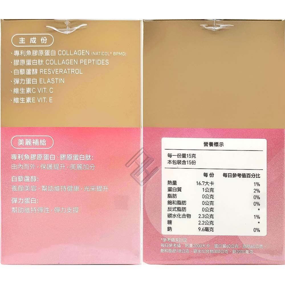 素E、魚膠原蛋白(含彈力蛋白)、葡萄皮萃取含白藜蘆醇(葡萄皮萃取、麥芽糊精)