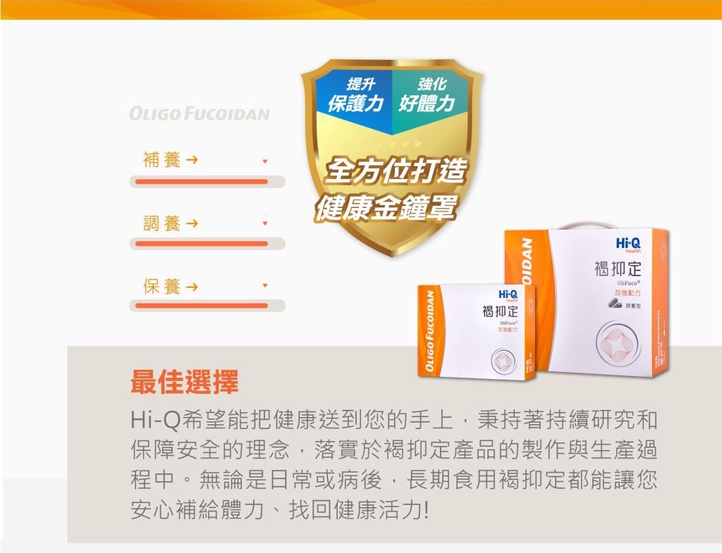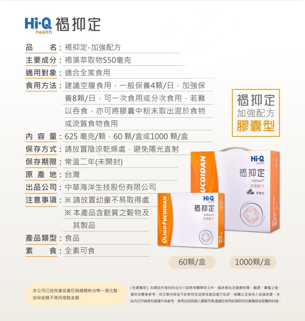 中華海洋生技-褐藻保健專家褐藻「岩藻糖Fucose」為主之多醣體,含Fucoidan精華成分品名:褐抑定-加強配方 膠囊型成分:OliFuco®褐藻萃取物550毫克/顆【褐藻萃取物(含小分子褐藻醣膠)、小麥澱粉】、微結晶狀α-纖維素膠囊成分:植物膠囊:羥丙基甲基纖維素、純水、鹿角菜膠、二氧化鈦、氯化鉀、氧化鐵(紅色)、氧化鐵(黑色)食用方法:建議空腹食用,一般保養4顆/天,加強保養8顆以上/天或使用前諮詢醫師/藥師意見。可一次食用或分次食用。若難以吞食,亦可將膠囊中粉末取出混於食物或流質食物食用。內容量:625毫克/顆,60顆/盒保存方式:請放置陰涼乾燥處,避免陽光直射保存期限:常溫兩年(未開封)產品批號/有效日期(西元年/月/日):詳見包裝標示原產地:台灣出品公司:中華海洋生技股份有限公司公司地址:台北市松山區八德路四段123-1號1樓諮詢電話:0800-043-388注意事項:1.請放置幼童不易取得處 2.本產品含麩質之穀物及其製品3.本產品粉末萃取自自然褐藻,色差屬正常情況,請安心食用食品全素可食