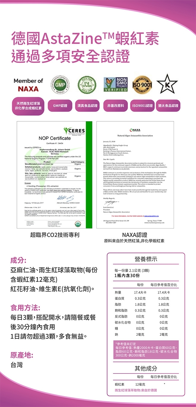 ■產品成份:亞麻仁油、雨生紅球藻萃取物(每份含蝦紅素12毫克)、紅花籽油、維生素E(抗氧化劑)