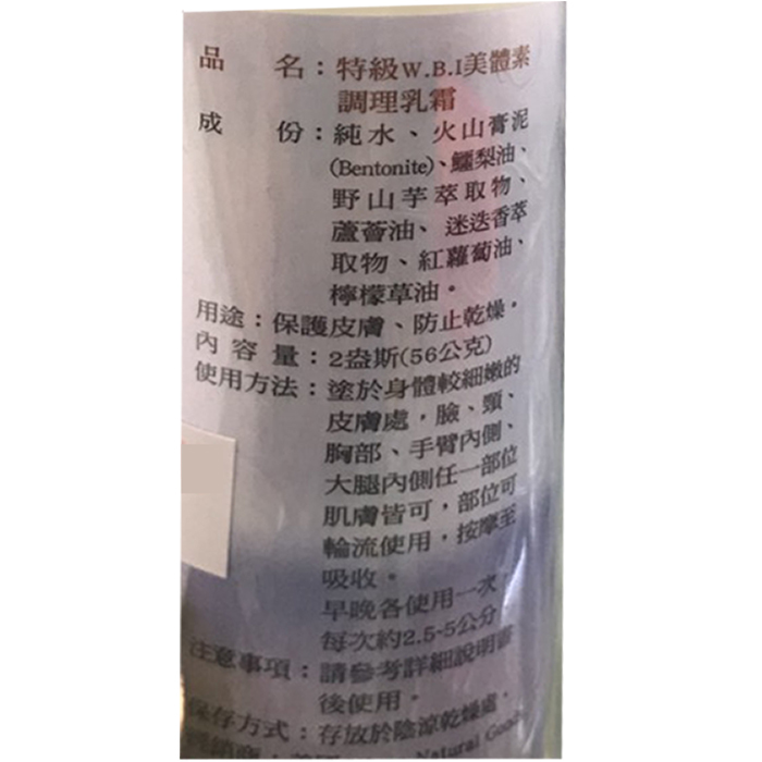 純水、維生素E、天然甘油、鱷梨油、野山芋萃取物、蘆薈油、火山膏泥、迷迭香萃取物、紅蘿蔔油、檸檬草油。