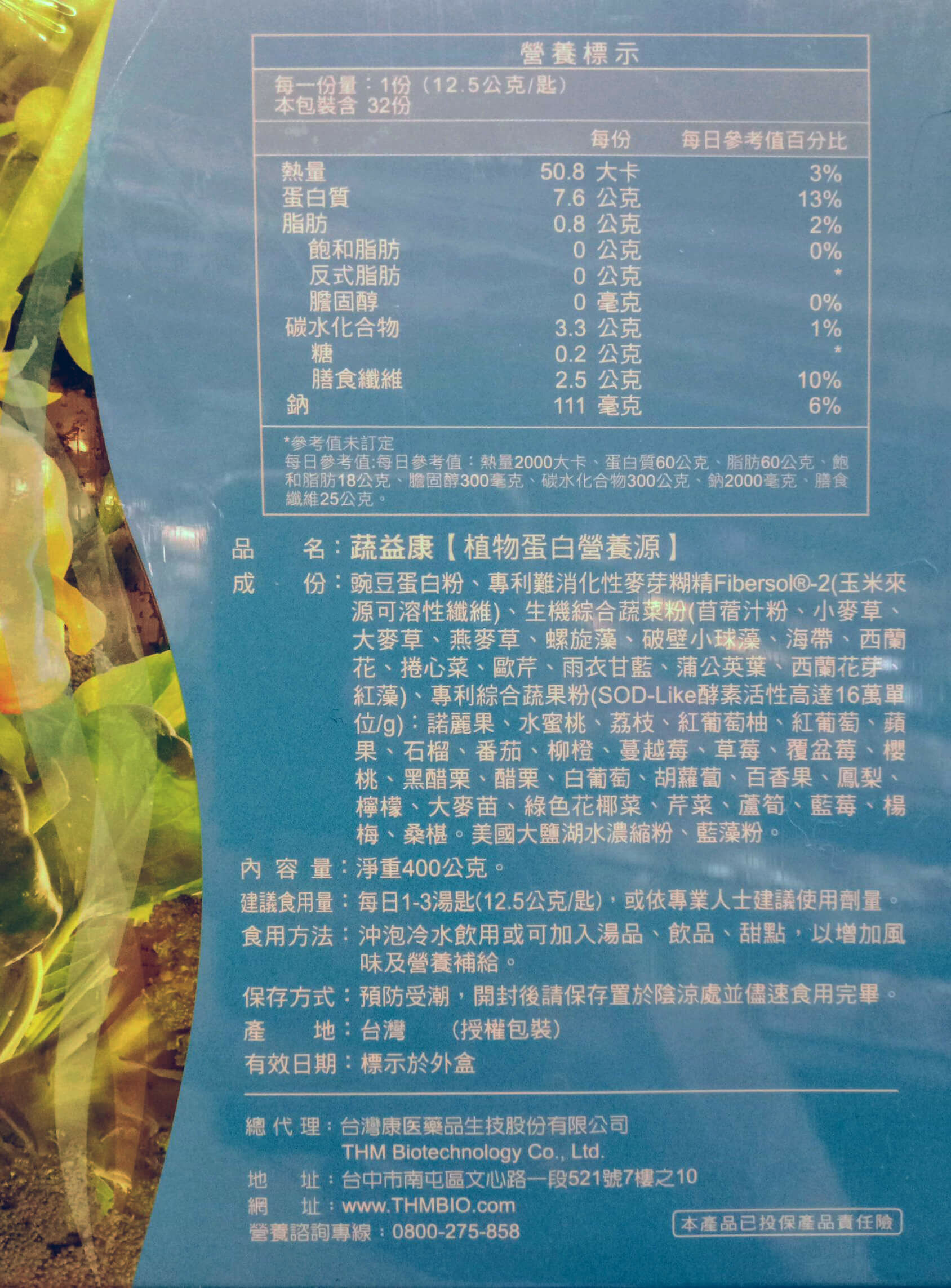 成 份 豌豆蛋白粉、專利難消化性麥芽糊精Fibersol®-2(玉米來源可溶性纖維)、生機綜合蔬菜粉(苜蓿汁粉、小麥草、大麥草、燕麥草、螺旋藻、破壁小球藻、海帶、西蘭花、捲心菜、歐芹、雨衣甘藍、蒲公英葉、西蘭花芽、紅藻)、專利綜合蔬果粉(SOD-Like酵素活性高達16萬單位/g):諾麗果、水蜜桃、荔枝、紅葡萄柚、紅葡萄、蘋果、石榴、番茄、柳橙、蔓越莓、草莓、覆盆莓、櫻桃、黑醋栗、醋栗、白葡萄、胡蘿蔔、百香果、鳳梨、檸檬、大麥苗、綠色花椰菜、芹菜、蘆筍、藍莓、楊梅、桑椹。美國大鹽湖水濃縮粉、藍藻粉。