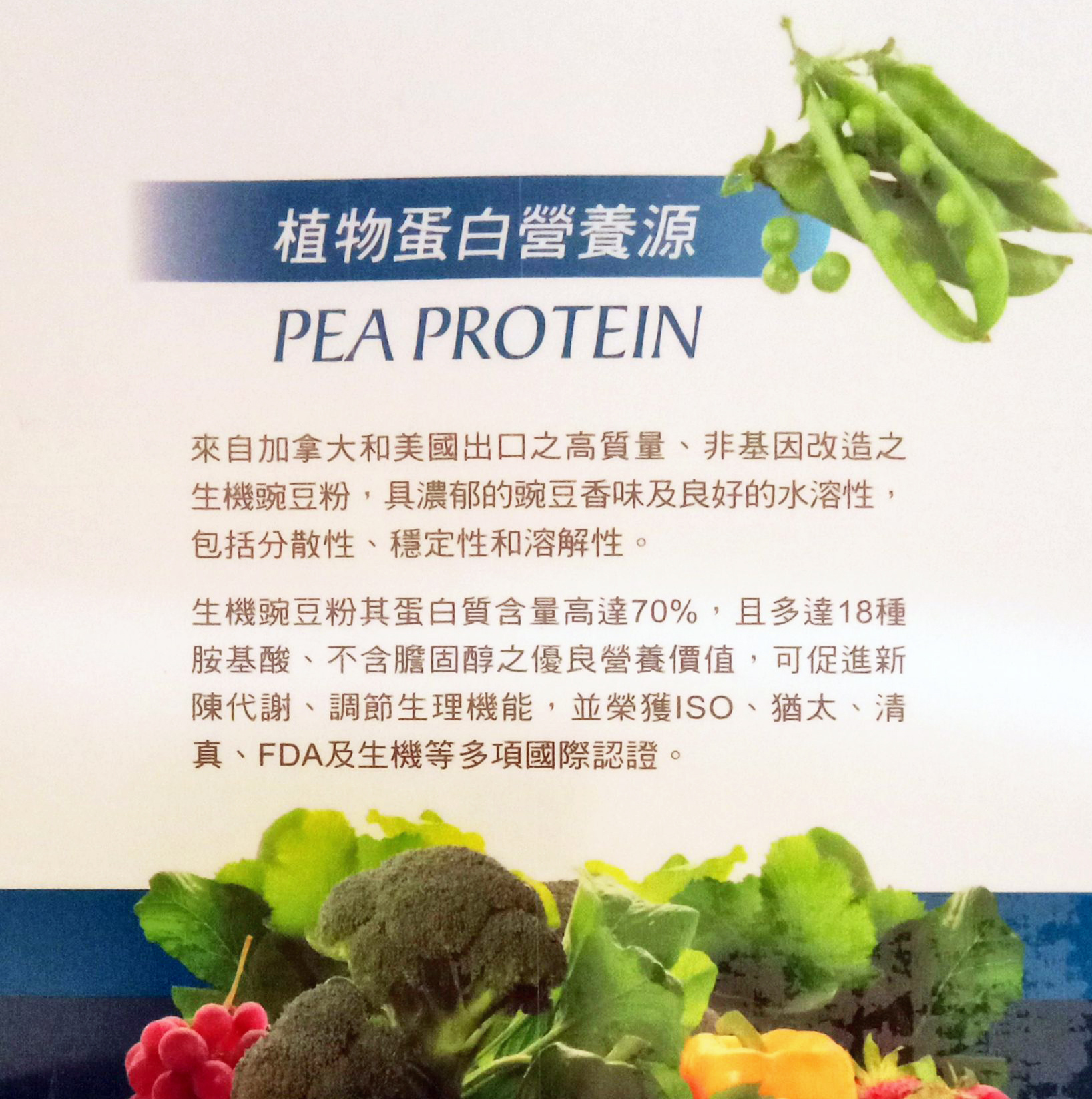 THM來自加拿大和美國出口之高品質、非基因改造的生機豌豆粉,其蛋白質含量高達70%,具濃郁的豌豆香味及良好的溶解性,且多達18種胺基酸,不含膽固醇之優良營養價值,可促進新陳代謝、調節生理機能,並榮獲ISO、猶太、清真、FDA及生機等多項國際認證。