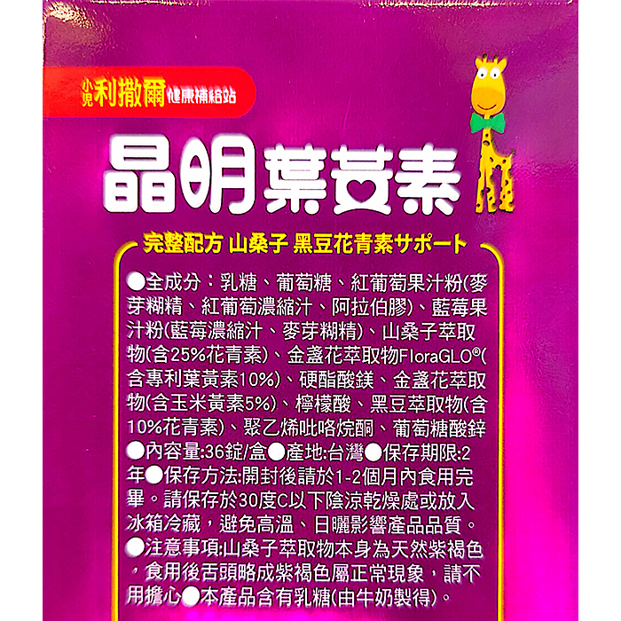 主成分:乳糖、葡萄糖、紅葡萄果汁粉(麥芽糊精、紅葡萄濃縮汁、阿拉伯膠)、藍莓果汁粉(藍莓濃縮汁、麥芽糊精)、山桑子萃取物(含花青素25 %)、FloraGLO®專利葉黃素10%(葉黃素、辛烯基丁二酸鈉澱粉、乾燥葡萄糖漿、蔗糖、L抗壞血酸鈉(抗氧化劑))、硬酯酸鎂、金盞花萃取物含玉米黃素5%(金盞花、麥芽糊精)、檸檬酸、黑大豆種皮萃取物(含10%花青素)、聚乙烯吡咯烷酮、葡萄糖酸鋅