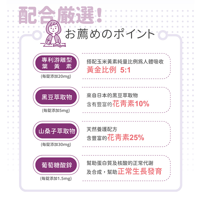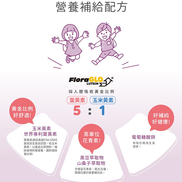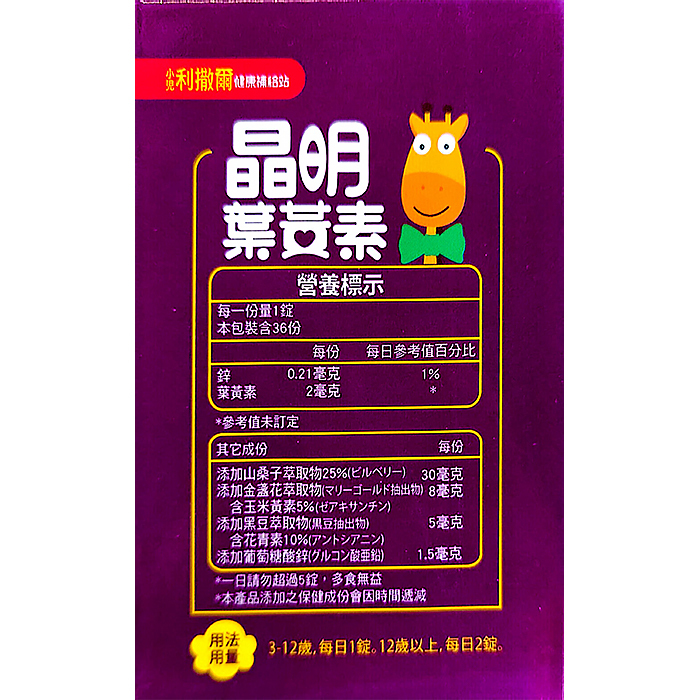 專為學齡兒童設計,添加純量2mg專利葉黃素、玉米黃素、是經常閱讀、打電腦、看電視兒童的營養補充品。葉黃素是存在於蔬菜水果的一種類胡蘿蔔素,人體無法自行合成,必須由食物或營養補充品中攝取。有小朋友喜歡的藍莓果汁口味,不添加人工防腐劑,好吃無負擔。