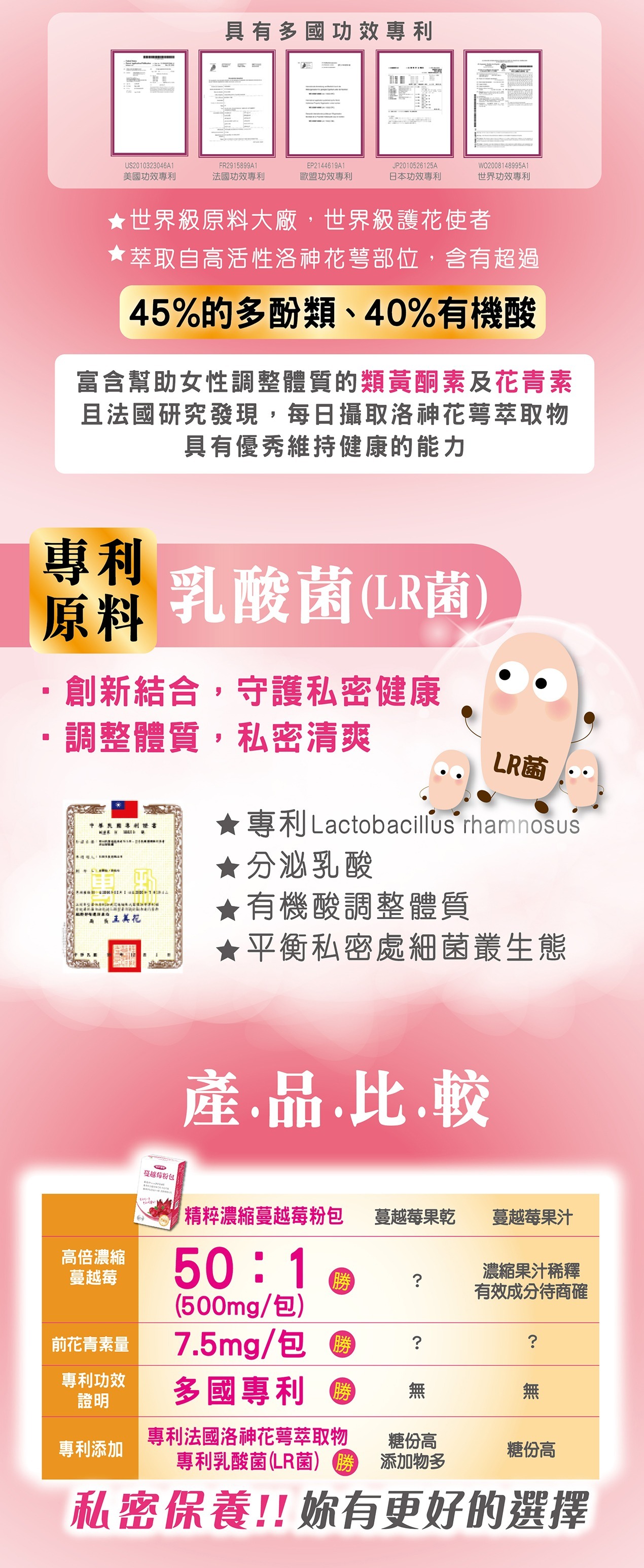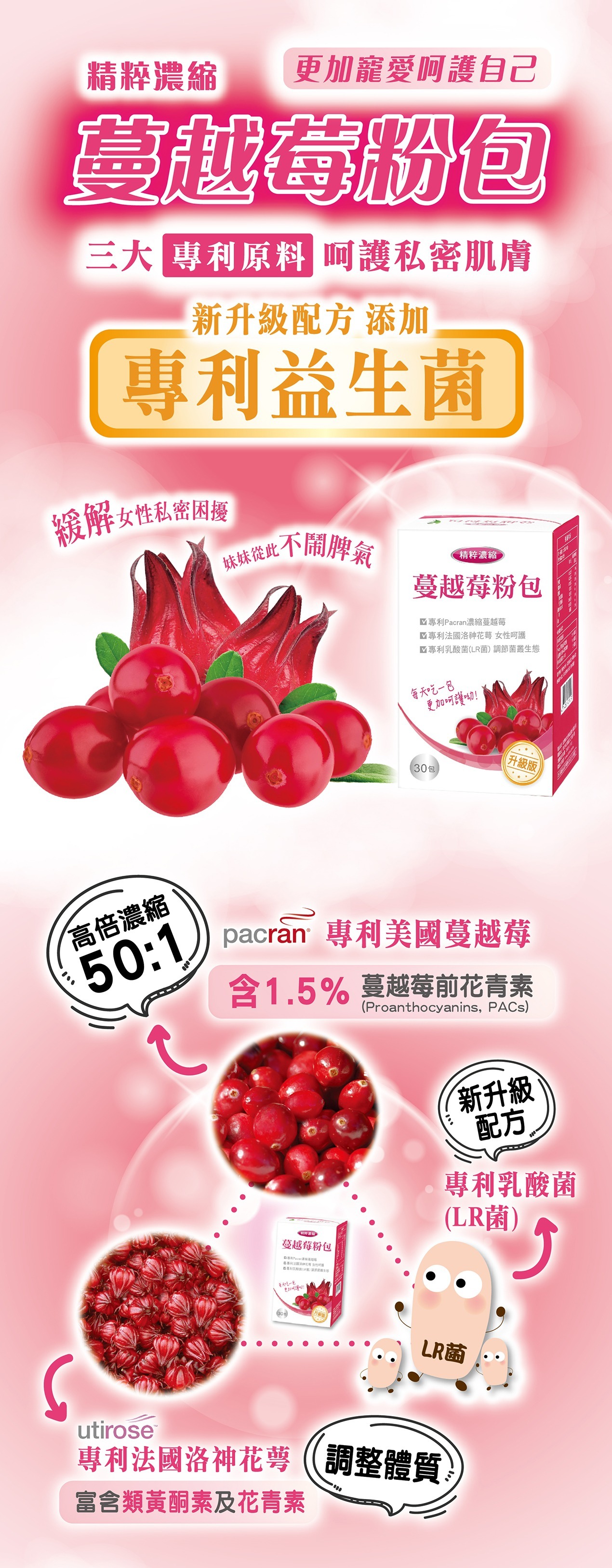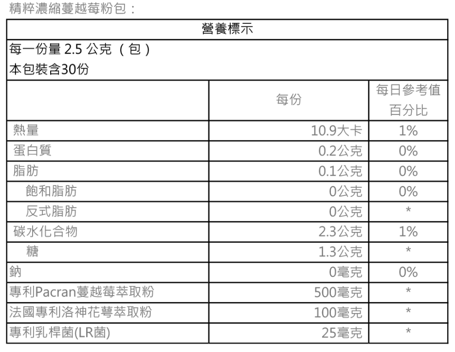 內容物:砂糖、Pacran蔓越莓萃取、即溶蔓越莓果汁粉【砂糖、蔓越莓果汁粉〔麥芽糊精、蔓越莓濃縮汁、葡萄汁色素、黏稠劑(辛烯基丁二酸鈉澱粉)、黑加侖濃縮汁〕、黏稠劑(辛烯基丁二酸鈉澱粉)、調味劑(檸檬酸、檸檬酸鈉)、玉米澱粉、調味劑(蘋果酸)、蔓越莓香料〔黏稠劑(辛烯基丁二酸鈉澱粉)、麥芽糊精、蔓越莓香料、β-環狀糊精、乳化劑(脂肪酸甘油酯)、抗氧化劑(維生素E)〕、著色劑〔β-胡蘿蔔素(麥芽糊精、中鏈三酸甘油酯、砂糖、阿拉伯膠、著色劑(β-胡蘿蔔素))〕、胭脂紅】、洛神花萼萃取(洛神花萼萃取、碳酸鈣)、蔓越莓果汁粉〔麥芽糊精、蔓越莓濃縮汁、葡萄汁色素、黏稠劑(辛烯基丁二酸鈉澱粉)、黑加侖濃縮汁、調味劑(檸檬酸)、蔓越莓香料〕、鼠李糖乳桿菌Lactobacillus rhamnosus(LR菌)、甜味劑(蔗糖素)