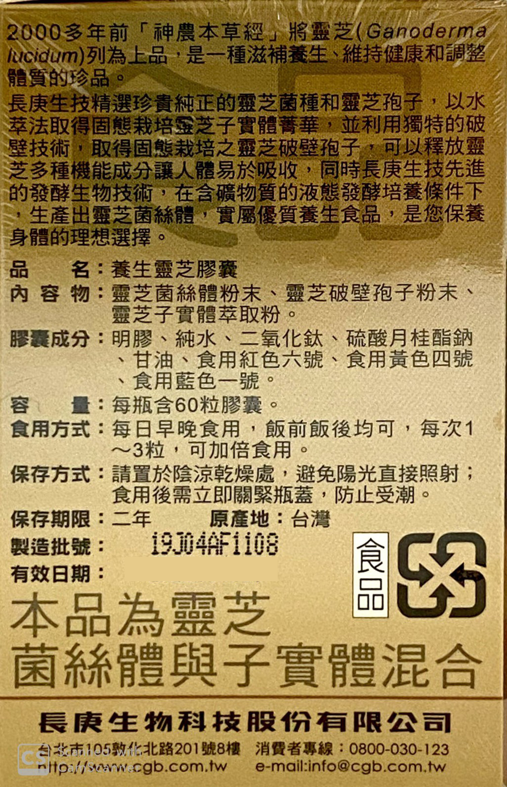 長庚靈芝,使用高純度靈芝菌絲體及高品質破壁孢子獨特配方,經過嚴格的管制,品質優良、成份穩定,而且不含乳糖、人工色素以及危害人體之防腐劑、雜質、重金屬等,實屬最佳養生補給品,敬請安心食用。
