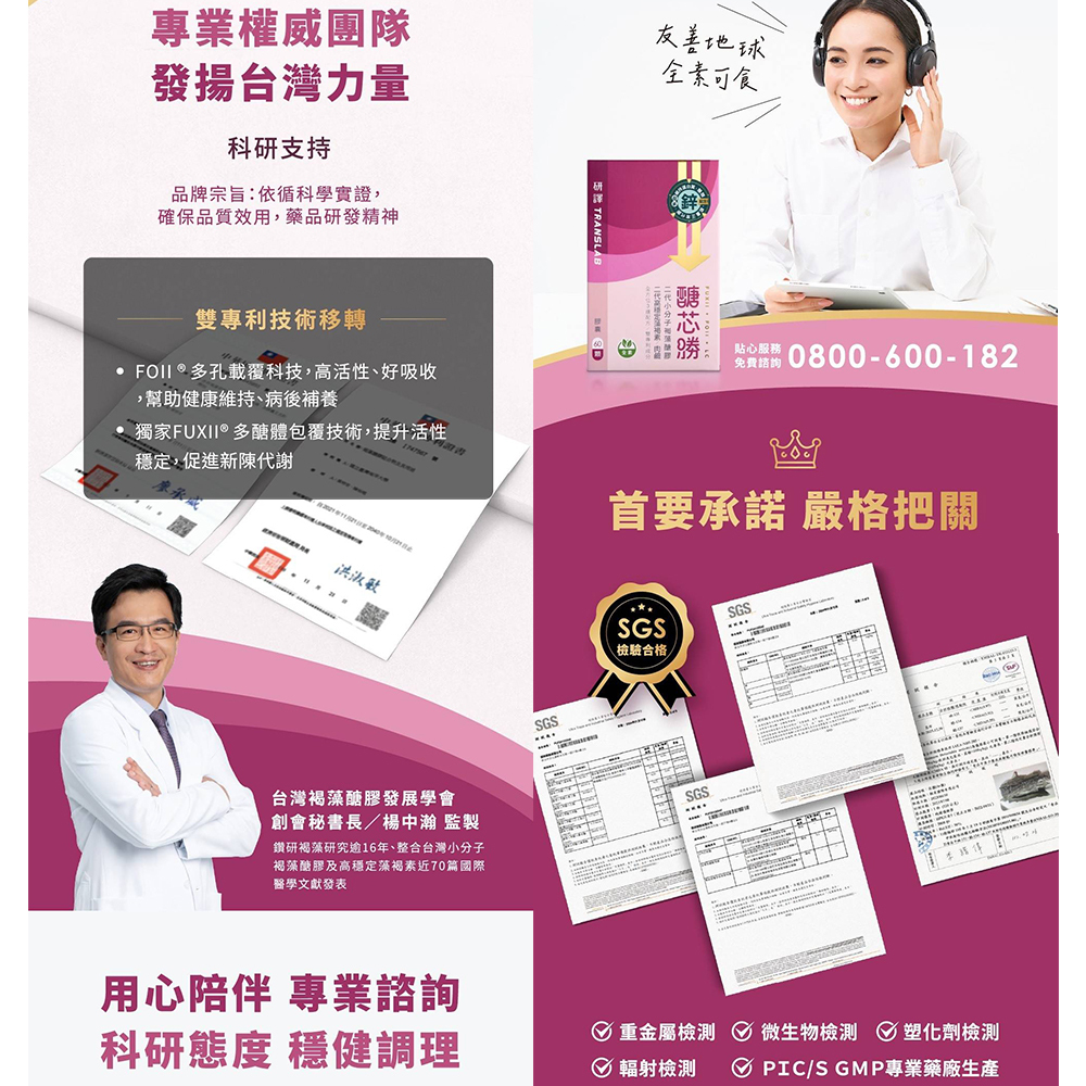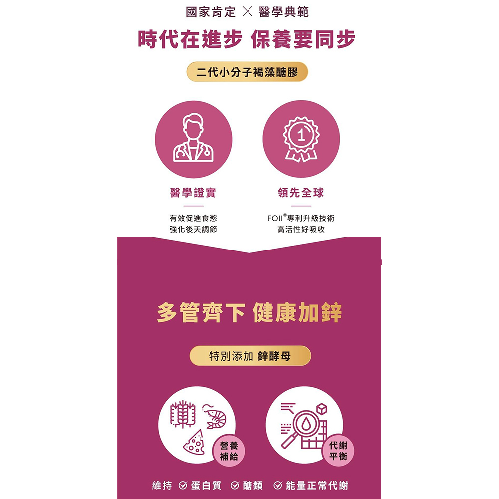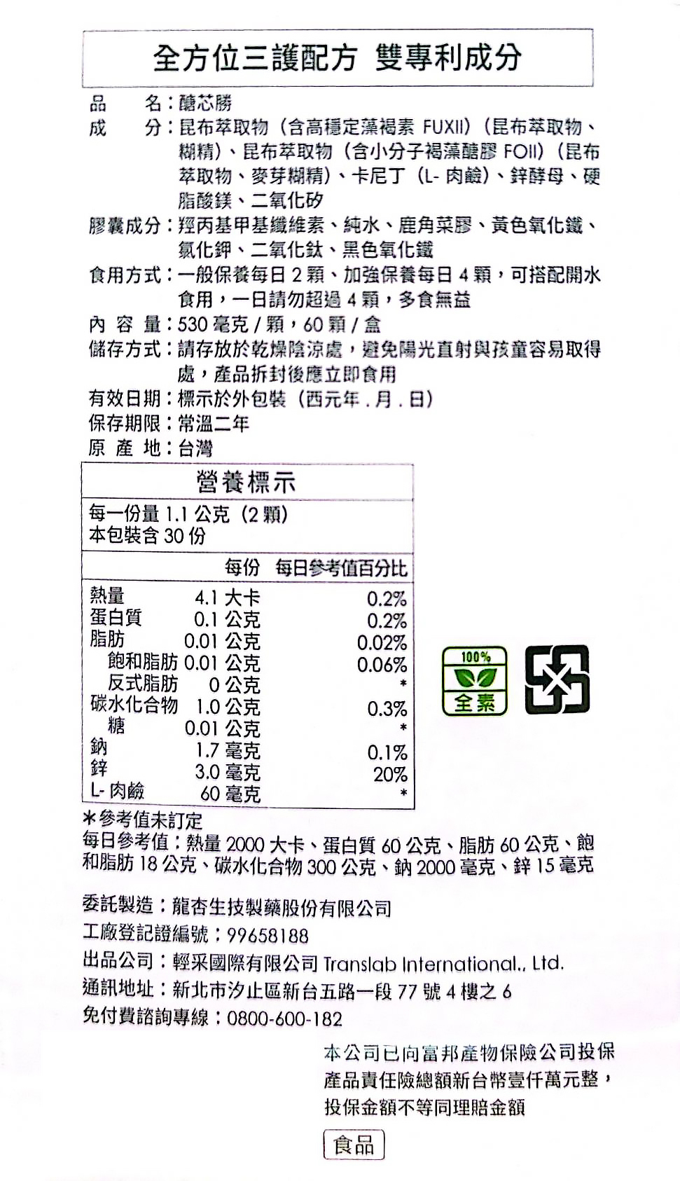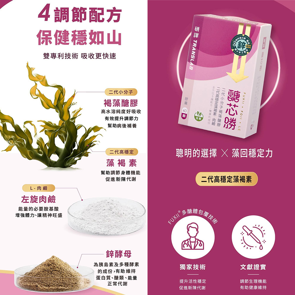 成分:昆布萃取物(含高穩定藻褐素 FUXII)(昆布萃取物、糊精)、昆布萃取物(含小分子褐藻醣膠 FOII)(昆布萃取物、麥芽糊精)、卡尼丁(L-肉鹼)、鋅酵母、硬