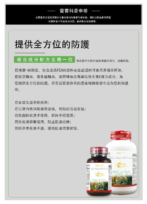 在空氣品質持續惡化、傳染風險升高的生活環境中,費淨康®軟膠囊以植萃複方配方,成為您日常呼吸道防護管理的理想選擇。